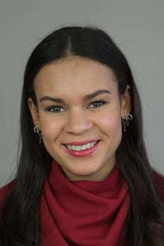 Evelyn zonder make-up met een kleur die niet helemaal past bij een wintertype. Wintertypes zijn mooier met kleuren waar blauwtonen in verwerkt zijn
